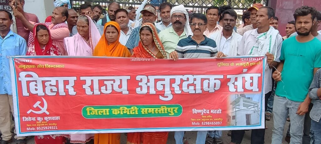 समस्तीपुर, 20 सितम्बर (मोहम्मद जमशेद) बिहार राज्य अनुरक्षक संघ, जिला कमिटी समस्तीपुर के आह्वान पर शनिवार को सैकड़ों की संख्या में अनुरक्षक शहर की सड़कों पर उतरे और समाहरणालय का घेराव किया। चीनी मिल चौक से जुलूस की शुरुआत हुई जो शहर के मुख्य मार्गों से होते हुए समाहरणालय तक पहुंचा। घेराव के बाद एक सभा का आयोजन किया गया जिसकी अध्यक्षता जितेन्द्र कुमार कुशवाहा ने की, जबकि संचालन विष्णुदेव महतो ने किया।