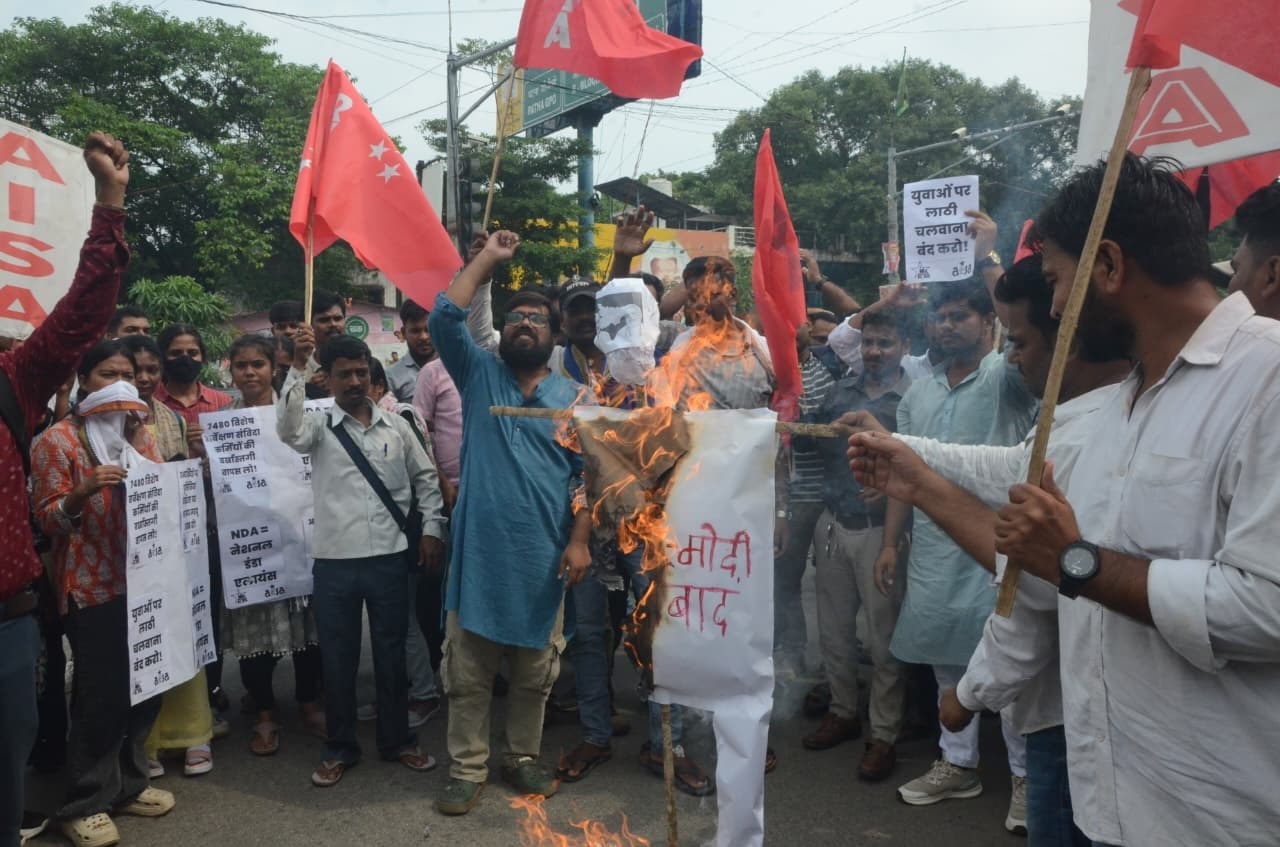 पटना, 14 सितम्बर (राजेश झा) 7480 विशेष सर्वेक्षण संविदाकर्मियों को बर्खास्त किए जाने के खिलाफ तथा उनकी बहाली एवं नियमितीकरण करने की मांग के समर्थन में आइसा आरवाईए ने पटना के आयकर गोलंबर पर मुख्यमंत्री नीतीश कुमार एवं प्रधानमंत्री नरेंद्र मोदी का पुतला दहन किया।सैकड़ों की संख्या में आइसा–आरवाईए के कार्यकर्ताओं ने एम एल ए फ्लैट कैंपस से मार्च निकालते हुए आयकर गोलंबर तक गए एवं वहां पुतला दहन किया।
