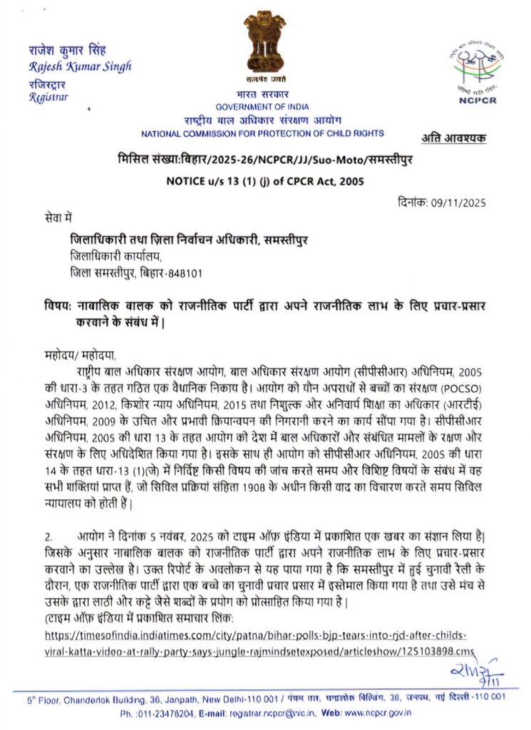 समस्तीपुर, 10 नवम्बर(समस्तीपुर डेस्क) राष्ट्रीय बाल अधिकार संरक्षण आयोग (एनसीपीसीआर) ने समस्तीपुर जिले में एक नाबालिग बच्चे को चुनावी रैली में मंच पर लाए जाने की खबर पर गंभीर रुख अपनाया है। आयोग ने इसे बच्चों के अधिकारों का उल्लंघन माना और जिले के डीएम को तीन दिनों में विस्तृत रिपोर्ट देने का निर्देश दिया है।