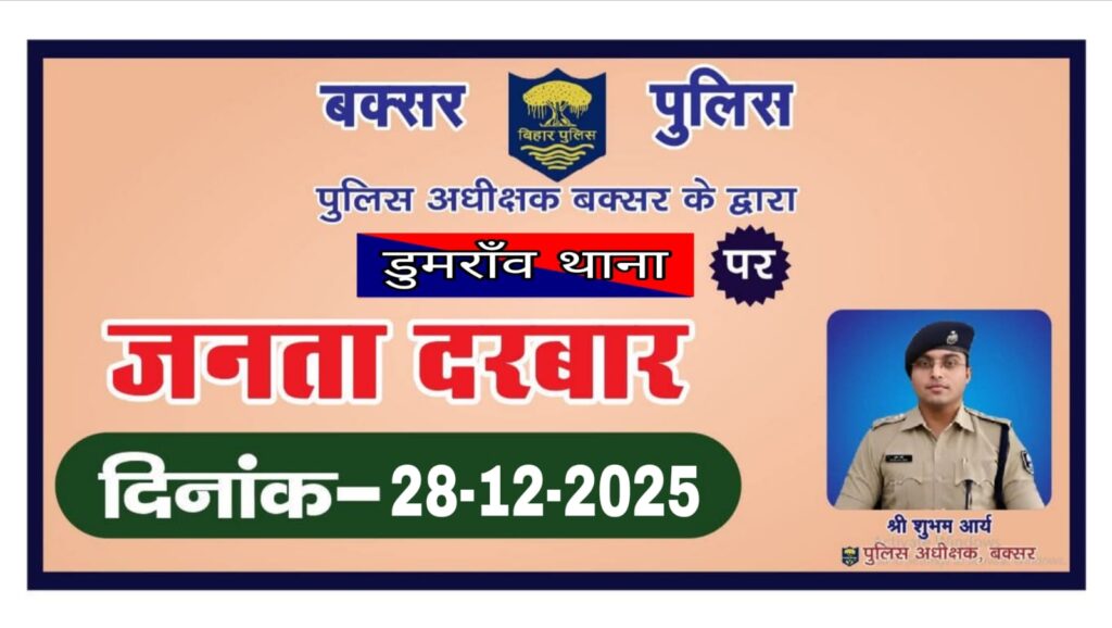 बक्सर, 27 दिसम्बर (विक्रांत) आम जनता की समस्याओं के त्वरित समाधान को लेकर बक्सर पुलिस प्रशासन एक्शन मोड में है। इसी कड़ी में दिनांक 28-12-25 को पुलिस अधीक्षक बक्सर शुभम आर्य के द्वारा डुमरांव थाना परिसर में जनता दरबार का आयोजन किया जाएगा। जनता दरबार में डुमरांव थाना क्षेत्र के नागरिक अपनी-अपनी समस्याएं, शिकायतें और सुझाव सीधे पुलिस अधीक्षक के समक्ष रख सकेंगे।