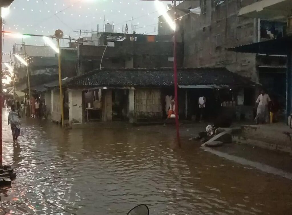 मऊ बाजार में एक से दो फीट तक पानी भर गया है, जिससे दुकानदारों की बिक्री पर असर पड़ा है। हर साल दुर्गा नवमी के दिन देर रात तक मेले में भारी भीड़ जुटती थी और व्यापारियों को अच्छी आमदनी होती थी, लेकिन इस बार मौसम ने उनकी उम्मीदों पर पानी फेर दिया।