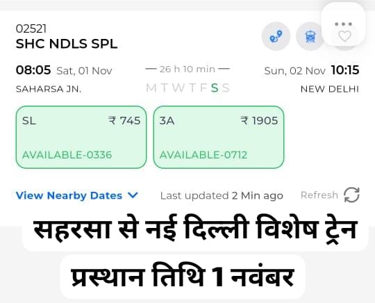 त्योहारों पर सहरसा–नई दिल्ली के लिए विशेष ट्रेन 1 नवंबर को होगी रवाना