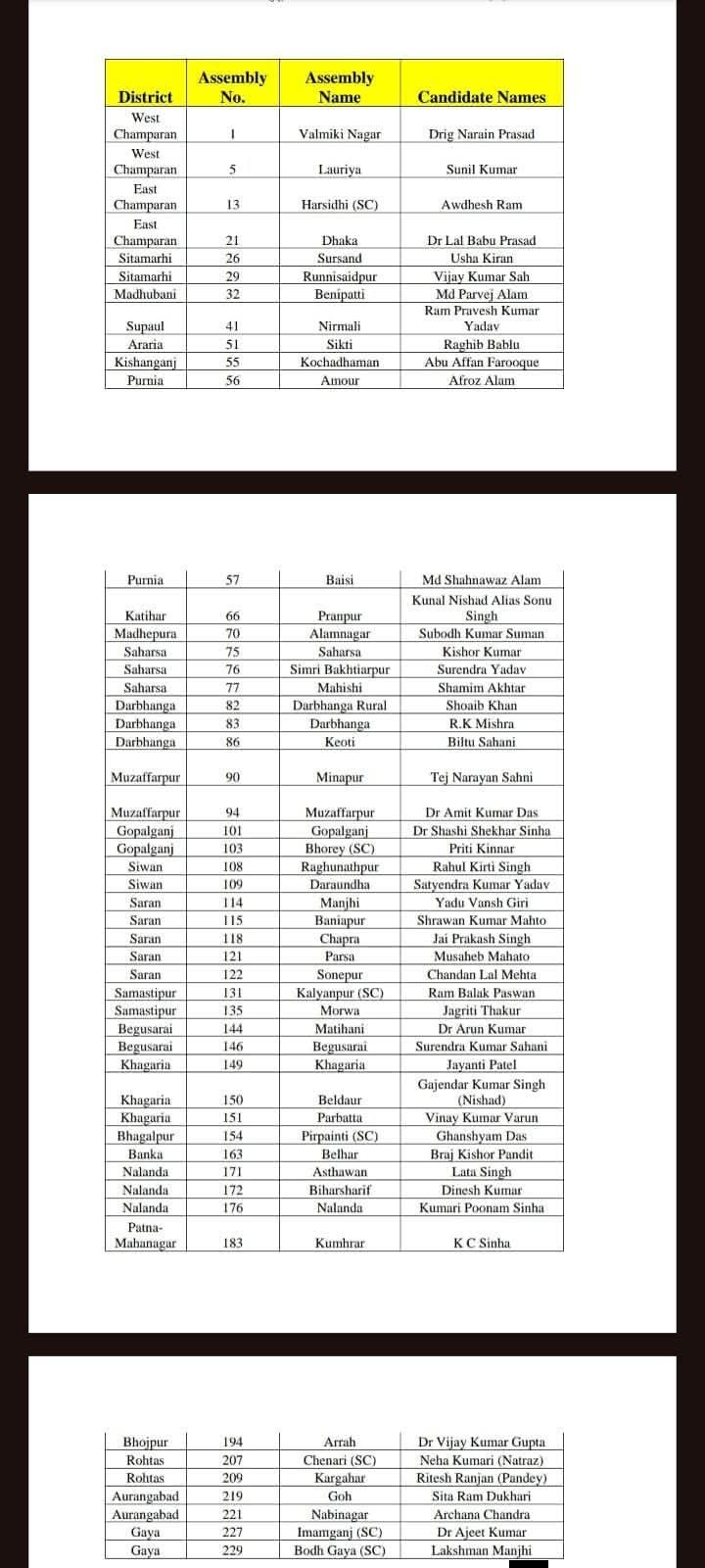 जनसुराज ने यह संदेश देने की कोशिश की है कि वह राजनीति में नए और स्वच्छ चेहरों को मौका देना चाहता है।सूत्रों के मुताबिक,घोषित प्रत्याशी बिहार के सभी क्षेत्रों सीमांचल,मगध,सारण, तिरहुत और मिथिलांचल से चुने गए हैं। गोपालगंज सदर विधान सभा 101 सीट से प्रख्यात चिकित्सक डॉ शशि शेखर सिन्हा,103 भोरे सुरक्षित से प्रीति किन्नर,सिवान के 108 रघुनाथपुर से राहुल कीर्ति सिन्हा, 109 दुरौंधा से सत्येंद्र कुमार यादव,सारण के 114 मांझी से उच्च न्यायालय के वरीय अधिवक्ता यदुवंश गिरी,115 बनियापुर से श्रवण कुमार महतों,118 छपरा सदर से पूर्व आईपीएस अधिकारी जय प्रकाश सिंह होंगे। वही समस्तीपुर,बेतिया,मोतिहारी,मधुबनी पटना, समस्तीपुर सुपौल,अररिया किशनगंज,पूर्णिया,रोहतास, औरंगाबाद,गयाजी,भोजपुर,नालंदा, बांका, भागलपुर, खगड़िया, दरभंगा,मुज़फ़्फरपुर सहरसा, मधेपुरा कटिहार,जैसे जिलों की सीटें इस सूची में शामिल हैं। जनसुराज के प्रवक्ता ने बताया कि यह तो बस शुरुआत है। अगले चरणों में शेष सीटों पर भी उम्मीदवारों की घोषणा की जाएगी। पार्टी ने कहा कि “हम राजनीति में पारदर्शिता,जवाबदेही और जनसहभागिता को लेकर मैदान में उतरे हैं। यह सूची उसी सोच का परिणाम है। राजनीतिक विश्लेषकों का मानना है कि नामांकन से पहले प्रत्याशियों की सूची जारी कर जनसुराज ने अन्य दलों को संकेत दिया है कि वह चुनावी दौड़ में पूरी तैयारी के साथ आ रहा है।