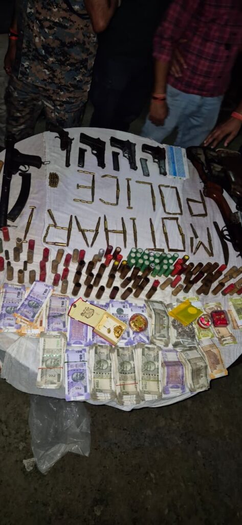 छापेमारी की जानकारी देते हुए एसपी स्वर्ण प्रभात ने बताया कि उक्त पति पत्नी द्वारा हथियार व शराब सप्लाई की गुप्त जानकारी के बाद उक्त गांव में उपेन्द्र सिंह के घर छापेमारी की गई। जहां से पुलिस ने 01 कारर्बाइन,3 देसी पिस्टल,1 देसी कट्टा,1 एकनाली बंदूक,01 एयरगन 8 एमएम की 49 पीस कारतूस,7.65 एमएम की 60 पीस,12 बोर की 33 व 73 खोखा लगभग 11 लीटर विदेशी शराब,2 लाख 56 हजार 230 रुपये व मोबाइल फोन बरामद किया है। वही पुलिस ने मौके से जितवारपुर गांव निवासी पति पत्नी उपेन्द्र सिंह व गुड़िया देवी को गिरफ्तार कर लिया है।