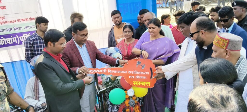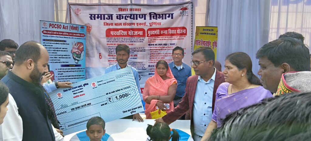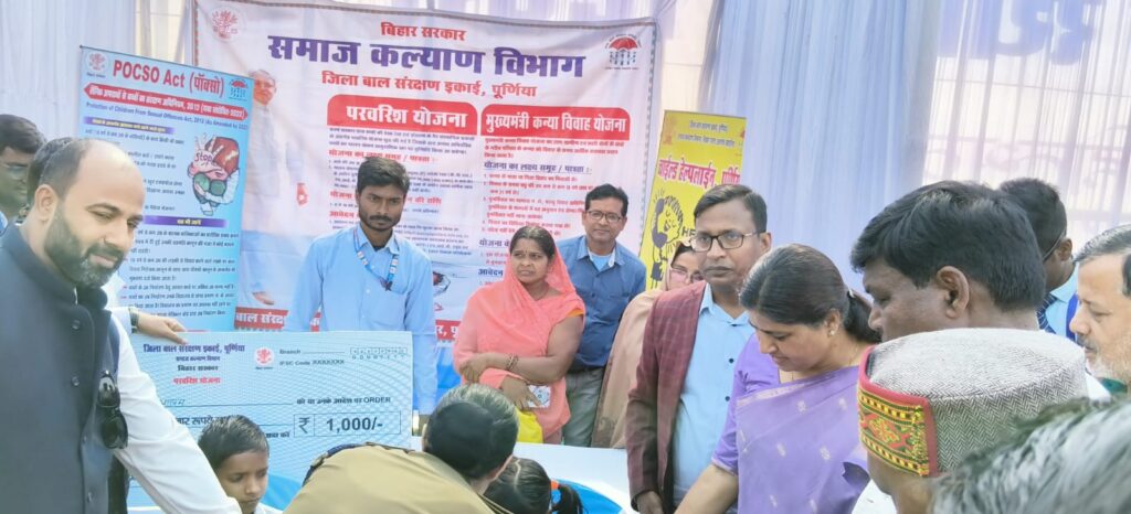 उक्त अवसर पर विभिन्न विभागों द्वारा स्टॉल के माध्यम से सरकार द्वारा संचालित योजनाओं का प्रचार प्रसार एवं योग्य लाभुकों को लाभान्वित किया गया।इसी क्रम में सामाजिक सुरक्षा एवं दिव्यांगजन सशक्तिकरण कोषांग, पूर्णिया द्वारा स्टाॅल के माध्यम से संचालित विभिन्न योजनाओं से योग्य लाभुकों को माननीय, खाद्य उपभोक्ता एवं संरक्षण मंत्री श्री लेशी सिंह द्वारासंबंधित लाभुकों को चेक तथा ट्राई साइकिल की चाभी आदि लाभ क्रमशः हस्तगत कराया गया।1:-मुख्यमंत्री अंतर्जातीय विवाह प्रोत्साहन अनुदान:-सामाजिक सुरक्षा अंतर्गत संचालित मुख्यमंत्री अंतर्जातीय विवाह प्रोत्साहन अनुदान योजना अंतर्गत विवाहित दम्पत्ति वर-मनोहर लाल एवं वधु-नुपूर कुमारी को प्रोत्साहन राशि स्वरूप मो0-100000/- एक लाख रूपये का सावधि प्रमाण-पत्र (fixed deposit) का dummy प्रदान किया गया।2:- वृद्धजनों के लिए चश्मा निःशुल्क वितरण:- बुनियाद केन्द्र, पूर्णिया से प्रदत 50 वर्ष या उससे अधिक आयुवर्ग के कुल-05 वृद्धजनों को मुख्यमंत्री उज्ज्वल दृष्टि योजना के तहत आंख जाँच करते हुए उन्हें निःशुल्क चश्मा उपलब्ध कराया गया। इस योजना के तहत दयानंद यादव, अनिता देवी, मो0 रिजुल अहमद, अजय मंडल, श्यामलाल मंडल को लाभान्वित किया गया।3:- बैट्री चालित ट्राईसाईकिल:- जिला दिव्यांगजन सशक्तिकरण कोषांग पूर्णिया द्वारा संचालित मुख्यमंत्री दिव्यांगजन सशक्तिकरण छत्र योजना ‘सम्बल’ के तहत कुल-05 चलन्त दिव्यांगजनों को बैट्री चालित ट्राईसाईकिल का वितरण किया गया है। इस योजना के तहत गयानंद पासवान, राजकुमार पासवान, पंकज कुमार झा, कृष्णदेव साह एवं नसतरी खातून को लाभान्वित किया गया।4:- प्रायोजन Sponshorship योजना:- जिला बाल संरक्षण इकाई संरक्षण इकाई, पूर्णिया द्वारा संचालित प्रायोजन Sponshorship योजना के तहत कुल-02 लाभुक अभिजा एवं कुणाल कुमार यादव को इस योजना के तहत लाभान्वित किया गया। इस अवसर पर माननीय विधायकगण एवं संबंधित अधिकारी उपस्थित थे।