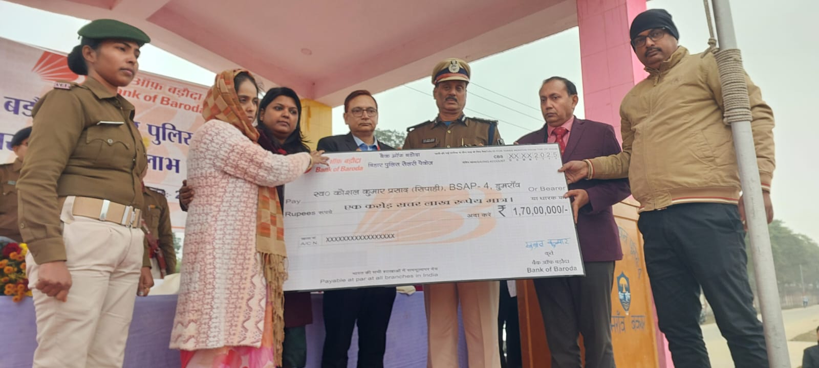 समारोह में बैंक ऑफ बड़ौदा द्वारा दुर्घटना में दिवंगत दो पुलिसकर्मियों के आश्रितों को बीमा राशि के चेक प्रदान किए गए। स्वर्गीय देवेंद्र पासवान की नॉमिनी रेणु देवी को 2 करोड़ रुपये और दिवंगत कौशल कुमार की पत्नी ममता देवी को 1.70 करोड़ रुपये की बीमा राशि प्रदान की गई। डीआईजी अजय कुमार पांडेय ने कहा कि पुलिसकर्मी समाज की सुरक्षा में दिन-रात लगे रहते हैं और ऐसी योजनाएं उनके परिवारों को संबल प्रदान करती हैं।बैंक के वरिष्ठ अधिकारियों ने पुलिसकर्मियों को बैंक की योजनाओं का लाभ लेने की अपील की। अंजुम आरा ने बीएमपी-4 सहित अन्य पुलिसकर्मियों को राज्य सरकार से वित्तीय सहयोग दिलाने में मदद का आश्वासन दिया।