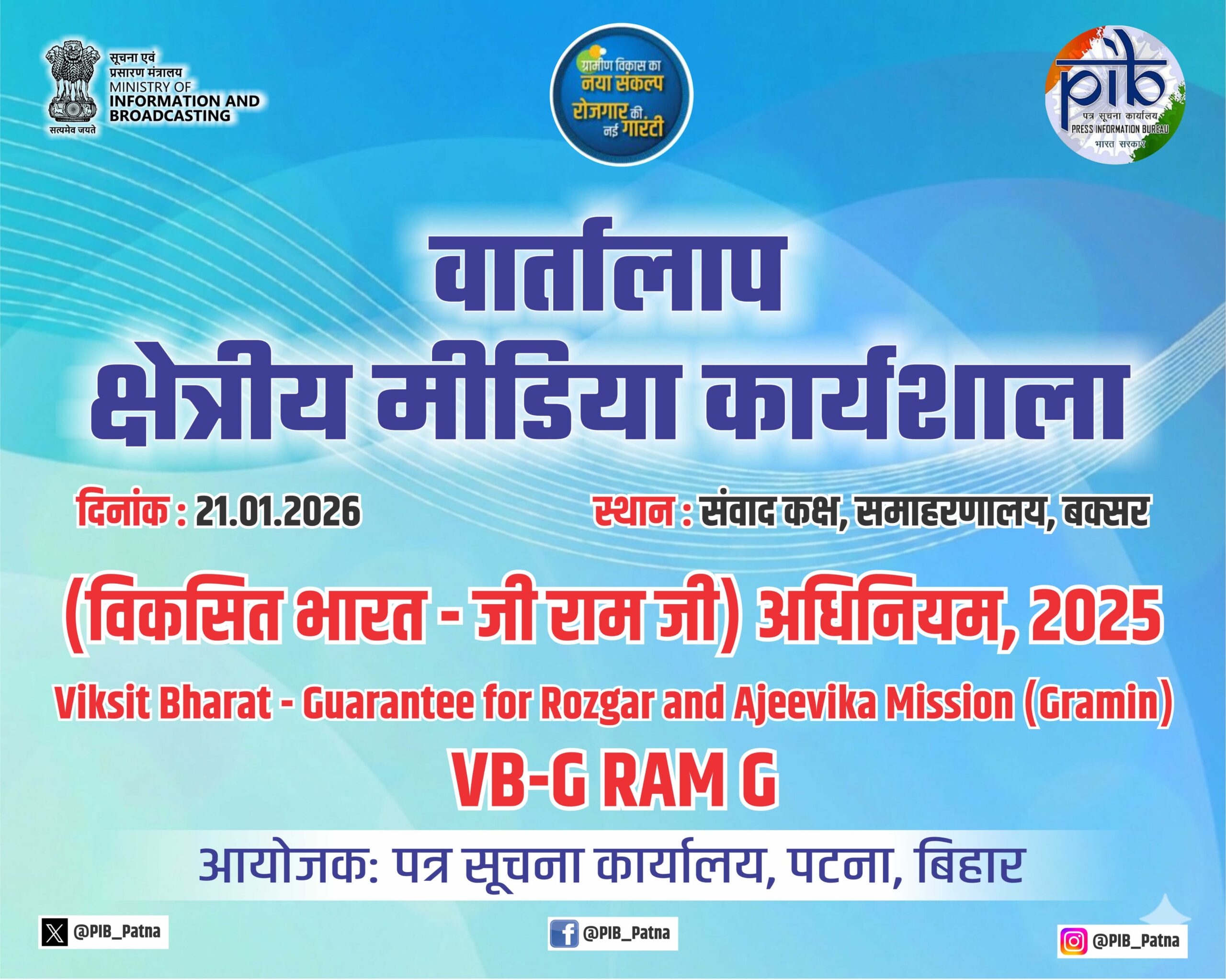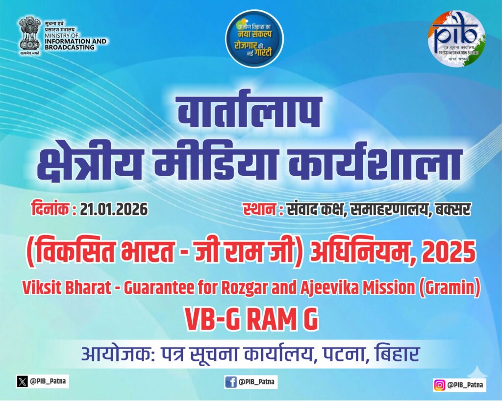 कार्यशाला का मुख्य उद्देश्य “विकसित भारत–रोज़गार एवं आजीविका के लिए गारंटी मिशन (ग्रामीण) (वीबी–जी राम जी) 2025” की अवधारणा, लक्ष्य और प्रमुख विशेषताओं की विस्तृत जानकारी देना है। इसके साथ ही विकासात्मक रिपोर्टिंग की बारीकियों, सामाजिक अभिप्रेरक के रूप में मीडिया की भूमिका, बदलते दौर में मीडिया के सामने उभरती नई चुनौतियाँ, मीडिया कौशल के उन्नयन तथा जनकल्याणकारी योजनाओं के प्रभावी प्रचार-प्रसार में मीडिया की सहभागिता जैसे अहम विषयों पर मंथन किया जाएगा।कार्यक्रम में बक्सर की जिलाधिकारी श्रीमती साहिला मुख्य अतिथि के रूप में उपस्थित रहकर पत्रकारों को संबोधित करेंगी।
