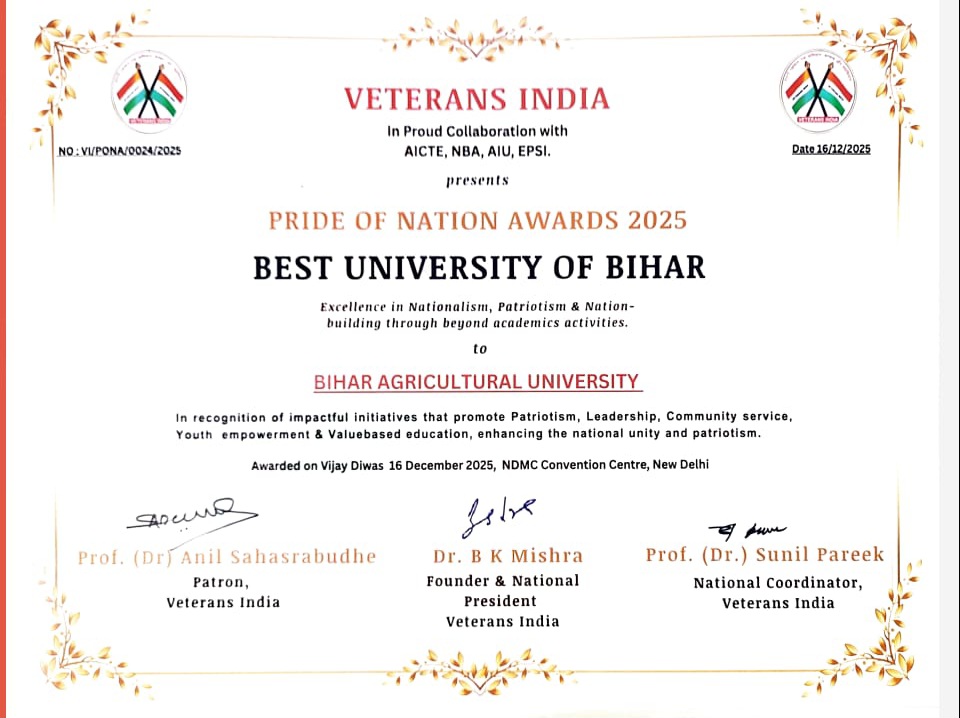 बक्सर, 20 दिसंबर (विक्रांत) बिहार के लिए गर्व का क्षण सामने आया है। बिहार कृषि विश्वविद्यालय (बीएयू), सबौर को ‘प्राइड ऑफ नेशन अवार्ड 2025’ से सम्मानित किया गया है। विश्वविद्यालय को यह प्रतिष्ठित सम्मान “बिहार राज्य का सर्वश्रेष्ठ विश्वविद्यालय: राष्ट्रवाद, देशभक्ति एवं राष्ट्र-निर्माण में उत्कृष्टता” की श्रेणी में प्रदान किया गया। यह गरिमामय समारोह 16 दिसंबर को नई दिल्ली स्थित एनडीएमसी कन्वेंशन सेंटर में आयोजित हुआ, जहां वेटरन्स इंडिया द्वारा राष्ट्रीय प्रत्यायन बोर्ड (एनबीए) के सहयोग से यह पुरस्कार प्रदान किया गया।