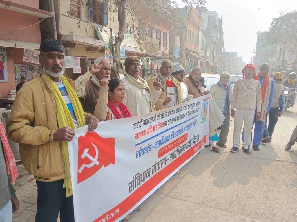 भाकपा माले ने गणतंत्र दिवस की पूर्व संध्या पर देशभर में “संविधान संकल्प–मताधिकार रक्षा दिवस” मनाने का आह्वान किया है। “संविधान व लोकतंत्र की रक्षा के लिए लड़ो, मताधिकार की रक्षा के लिए लड़ो” के नारों के साथ कार्यक्रम आयोजित किया गया।कार्यक्रम में ऐपवा जिला सचिव संध्या पाल, खेग्रामस जिला अध्यक्ष कन्हैया पासवान, जाबिर कुरैशी, पूजा कुमारी, ऊषा देवी, शंकर तिवारी, अरविंद यादव, राधेश्याम शर्मा, गणेश खरवार, सत्यनारायण गोंड, सुरेश यादव सहित कई कार्यकर्ता मौजूद रहे।