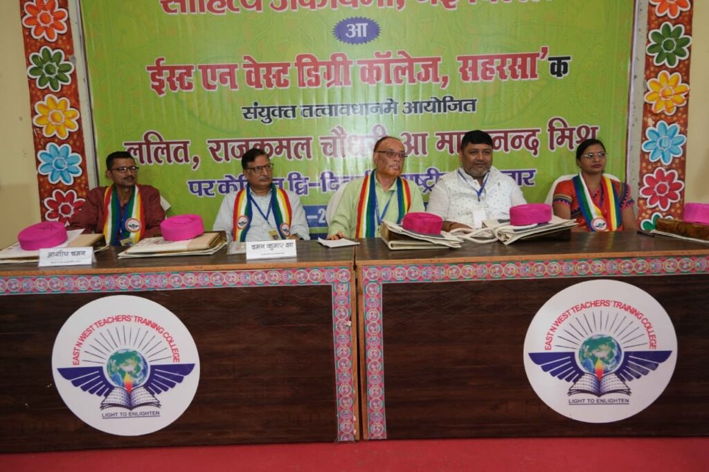 सहरसा (उषा मिश्रा) संस्कति मंत्रालय भारत सरकार के सहयोग से साहित्य अकादेमी नई दिल्ली और ईस्ट एन वेस्ट डिग्री काॅलेज के संयुक्त तत्वावधान में आयोजित मैथिली साहित्य के तीन नक्षत्र ललित, राजकमल चौधरी और मायानंद मिश्र पर केंद्रित दो दिवसीय राष्ट्रीय संगोष्ठी कई मायने में यादगार व सफल आयोजन रहा। संगोष्ठी के पहले दिन जहां मैथिली साहित्य के तीन नक्षत्र में से ललित व राजकमल चौधरी के जीवन वृत्त और मैथिली साहित्य और उनकी रचना पर केंद्रित वक्ताओं ने आलेख पाठ प्रस्तुत किया वहीं संगोष्ठी के दूसरे दिन प्रथम सत्र में मैथिली साहित्य के मूर्धन्य विद्वान मायानंद मिश्र पर केंद्रित रहा। मैथिली साहित्य के विद्वान केदार कानन की अध्यक्षता व ईस्ट एन वेस्ट टीचर्स ट्रेनिंग कॉलेज के सहायक प्राध्यापक सह जनसमपर्क पदाधिकारी अभय मनोज एवं किशलय कृष्ण के संचालन में आयोजित किया गया।