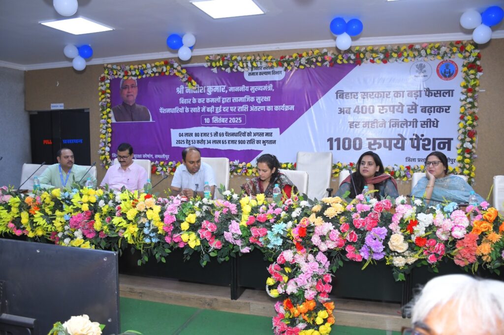 समस्तीपुर, 10 सितम्बर (राजेश झा) बुधवार को बिहार के मुख्यमंत्री द्वारा सामाजिक सुरक्षा पेंशन योजना के तहत् सभी 06 पेंशन योजना के लाभुकों को नई दर 400 से बढ़ाकर 1100 की दर से माह अगस्त की राशि भुगतान हेतु डी०बी०टी० के माध्यम से अंतरण एवं उनके संदेश का लाइव प्रसारण जिला स्तर पर समाहरणालय सभा कक्ष में 267 पेंशनधारियों की उपस्थिति में किया गया। इस अवसर पर माननीय मुख्यमंत्री द्वारा सभी पेंशनधारियों/लाभुकों को पेंशन की वर्द्धित दर की स्वीकृति हेतु बधाई दी गई।