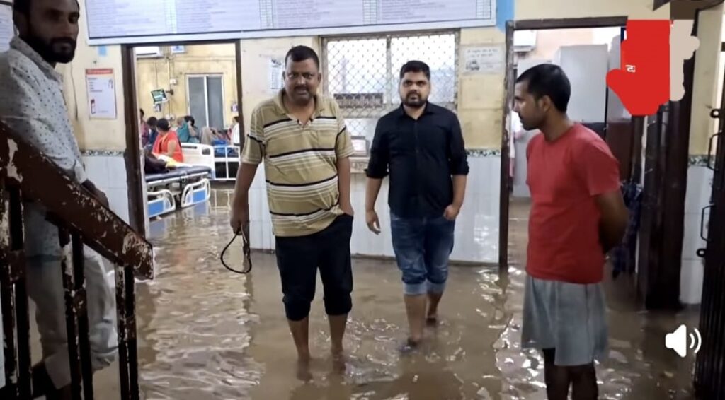 मॉडल सदर अस्पताल के इमरजेंसी वार्ड में चक्रवाती तूफान का असर मरीज के बेड के नीचे तक एफ फिट पानी