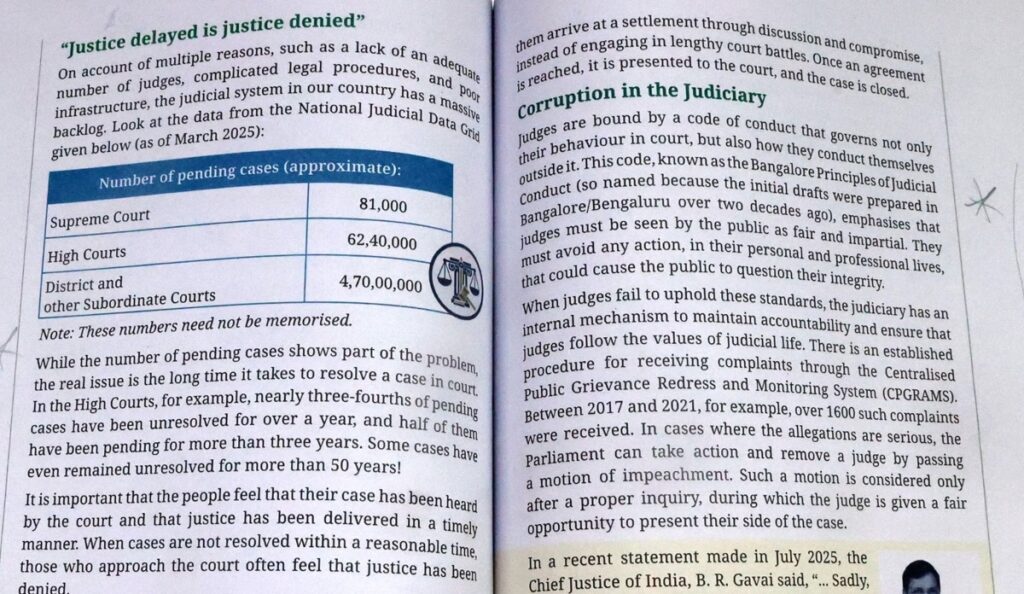 कक्षा 8 की सामाजिक विज्ञान की एनसीईआरटी (राष्ट्रीय शैक्षिक अनुसंधान और प्रशिक्षण परिषद) की नई पाठ्यपुस्तक में शामिल ‘न्यायपालिका में भ्रष्टाचार’ से संबंधित अंश को लेकर विवाद गहरा गया है। उच्च सरकारी सूत्रों के अनुसार, इस सामग्री को अब किताब से हटाया जाएगा। सरकार का मानना है कि इस प्रकार का विषय छोटे बच्चों के लिए उपयुक्त नहीं है और पाठ्यपुस्तकों में अधिक प्रेरणादायक तथा सकारात्मक सामग्री को प्राथमिकता दी जानी चाहिए।